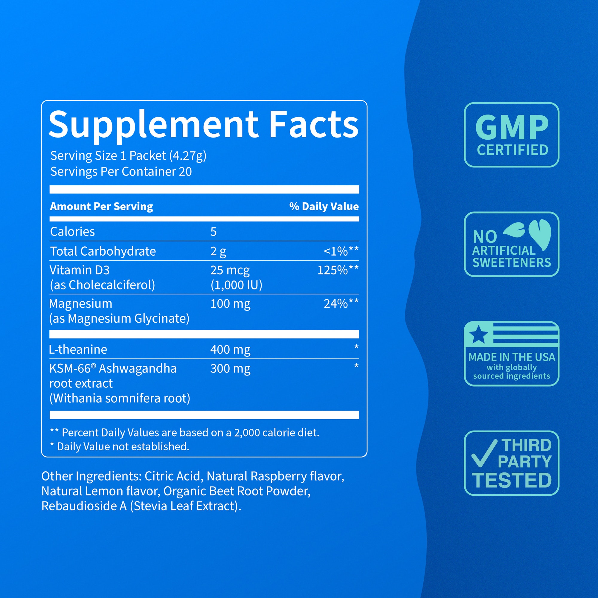 Supercalm isn’t just hype in a pretty package. Our signature formula was designed to support stress relief, mental clarity, and long-term cortisol balance. Every serving has 100 mg of magnesium glycinate to promote restful sleep and 300mg of KSM-66 ashwagandha to help reduce stress. These ingredients work together with vitamin-D3 and L-theanine to support your state of calm. It’s science you can sip.