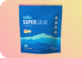 Blue packaging of 'nello SuperCalm' calming drink mix.
