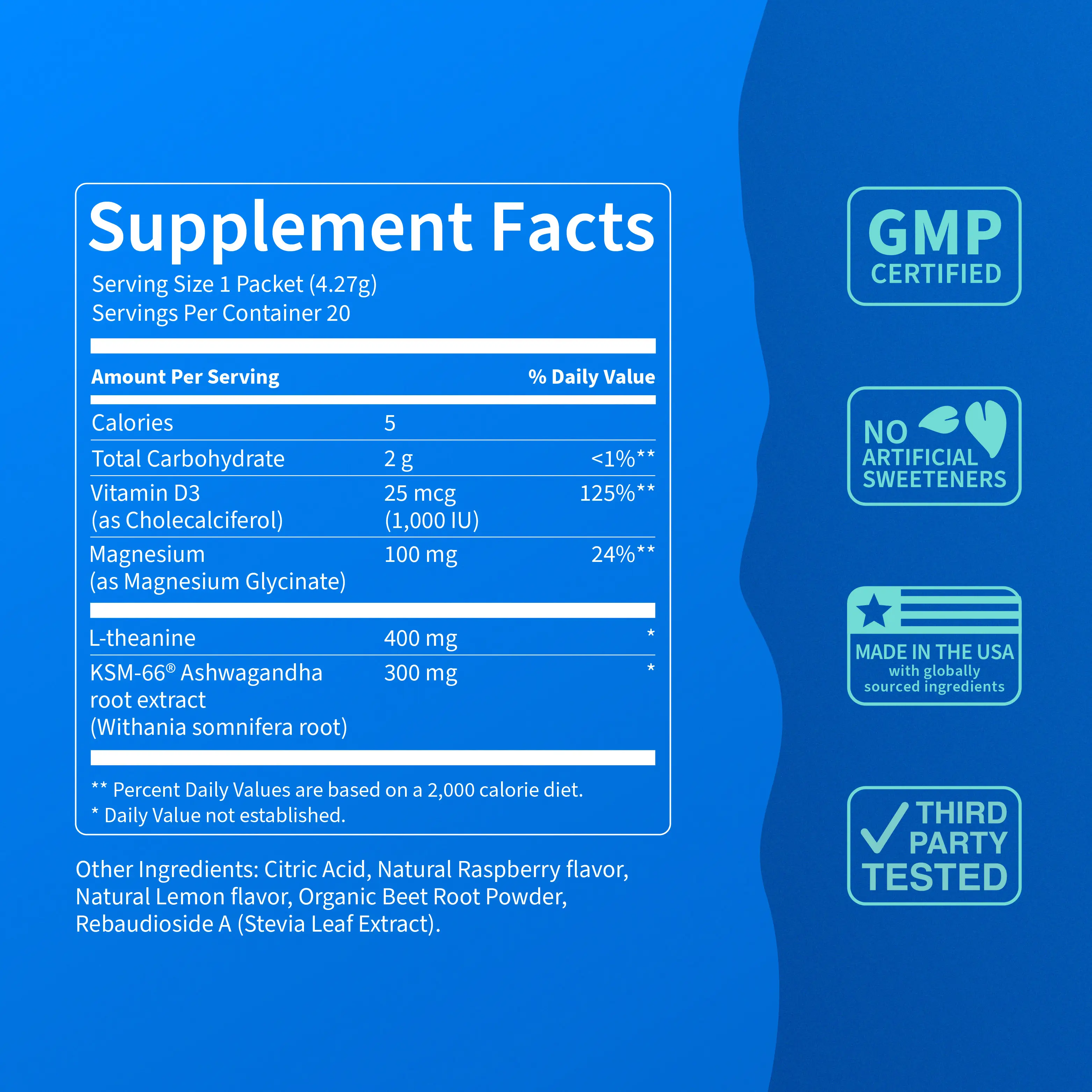 Product certifications: GMP, no artificial sweeteners, made in USA, third-party tested.